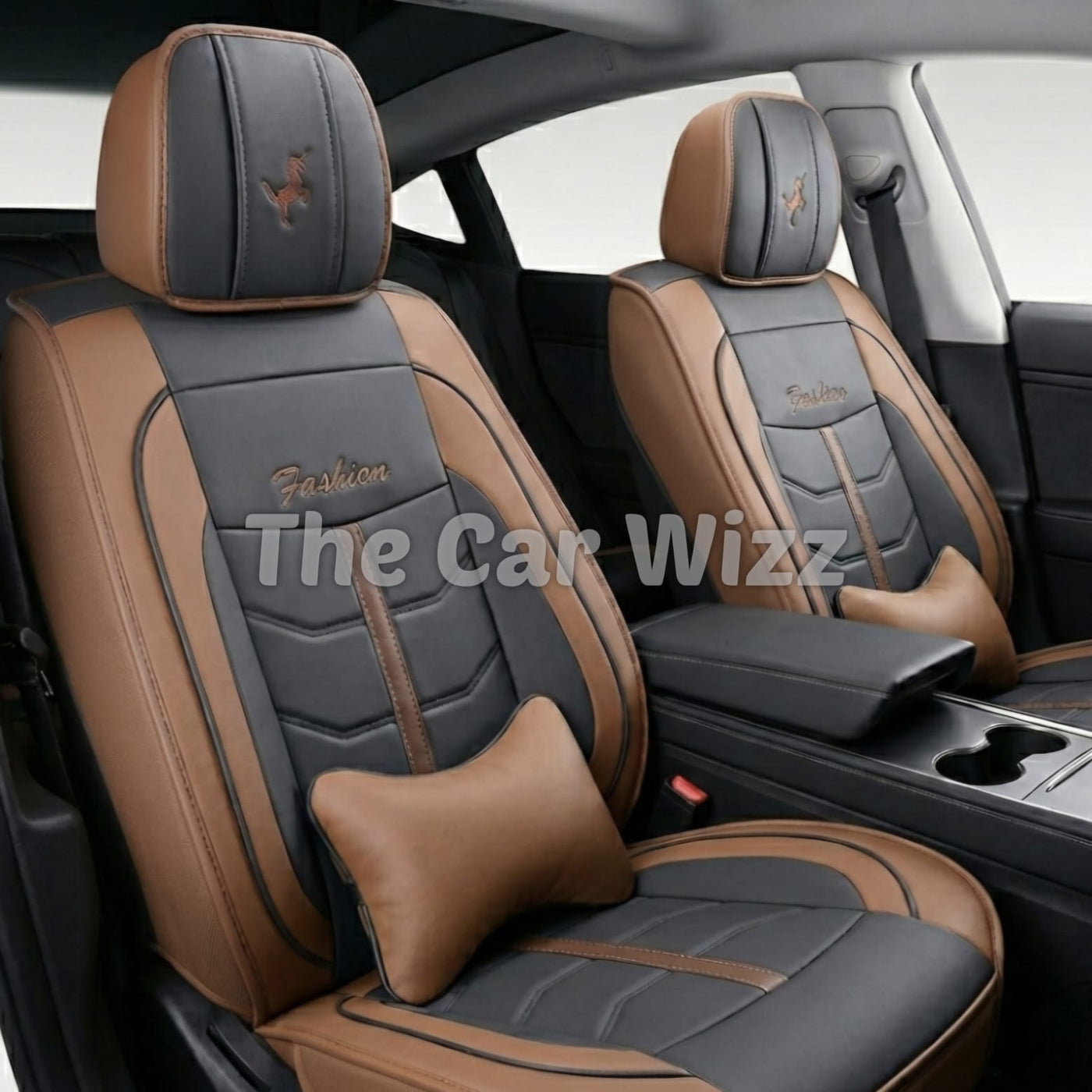 Upgrade your vehicle’s interior with our Premium Two-Tone Brown & Black Synthetic Leather Seat Covers, featuring a stylish quilted pattern and built-in neck pillows for enhanced comfort. Crafted from high-quality PU leather combined with breathable fabric inserts, these seat covers offer a luxurious feel while ensuring durability and easy maintenance.