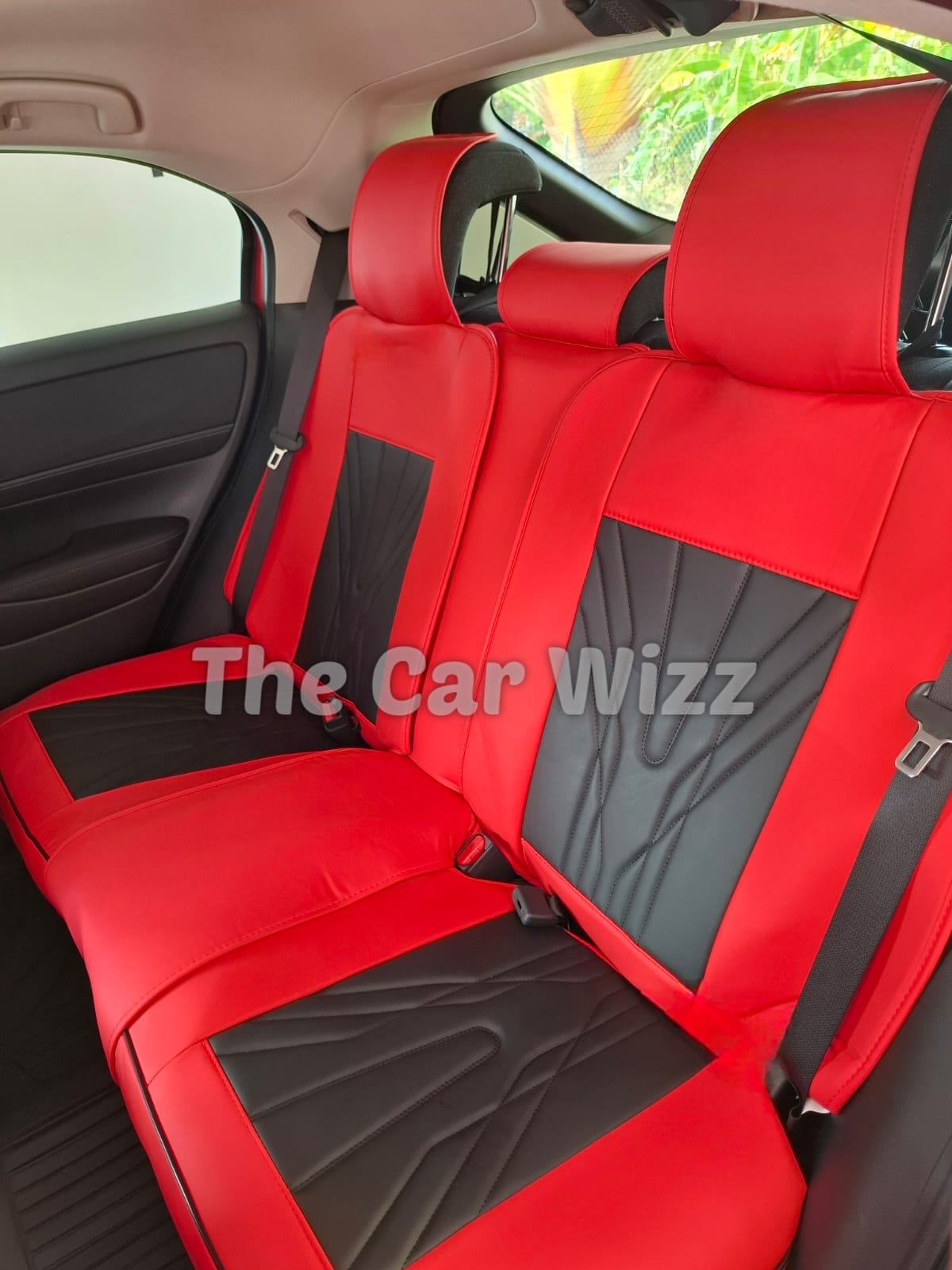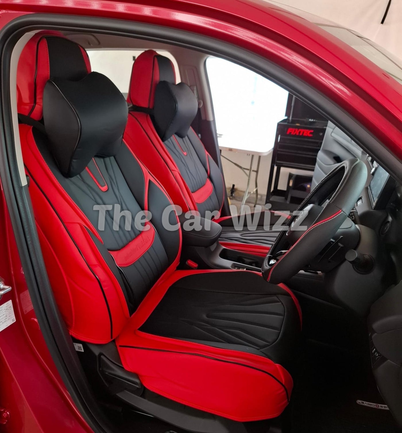 Elevate your vehicle’s interior with our Elite Comfort seat covers, showcasing a striking combination of sleek black and vibrant red accents. Designed for drivers who demand both style and lasting comfort, these covers feature contoured padding and detailed stitch patterns that enhance every drive. Made from durable, easy-to-clean synthetic leather, they protect your original seats from spills and daily wear while adding a bold, dynamic look. Included comfort neck pillows provide excellent support, making long journeys more enjoyable without sacrificing practicality.