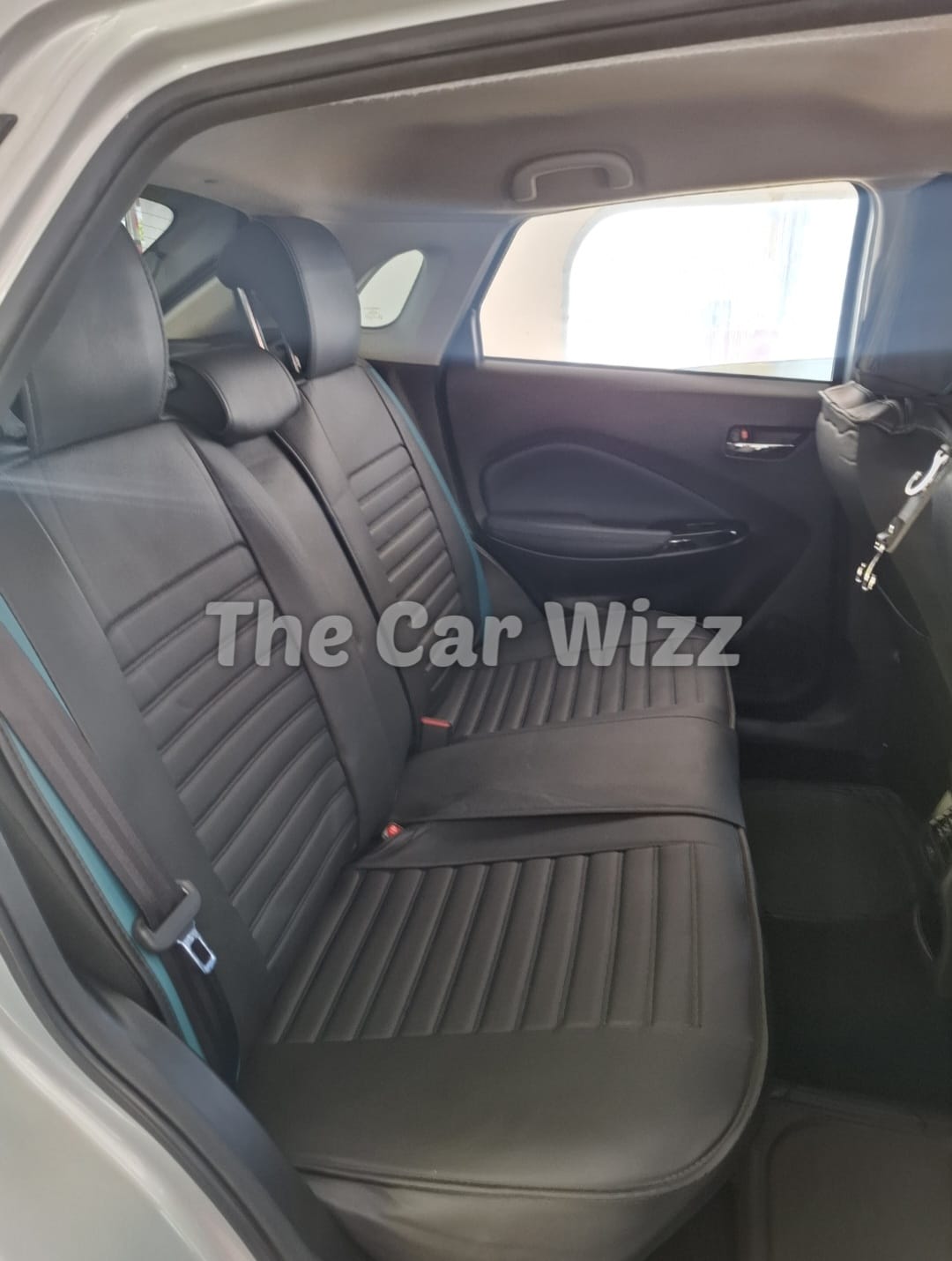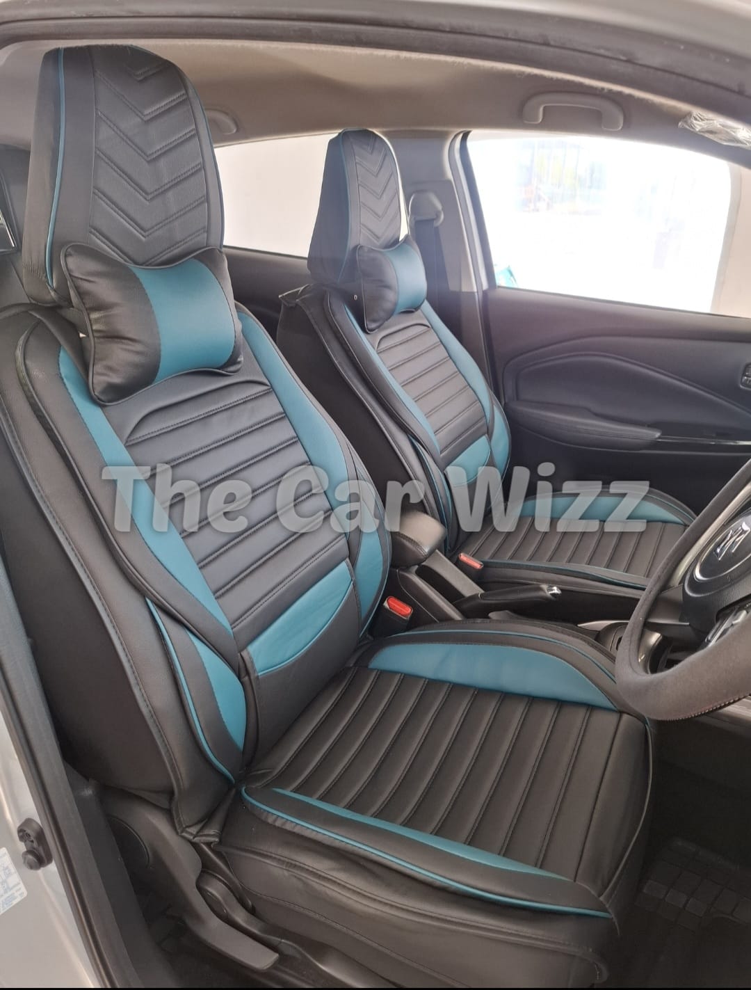 Elevate your vehicle’s interior with these premium black & teal synthetic leather seat covers, featuring a sleek matte finish and detailed ribbed stitching for a modern, sophisticated look. This set includes comfortable neck pillows and built-in lumbar support cushions, designed to enhance your driving comfort while protecting your original upholstery. Crafted for durability, style, and a snug custom fit, these covers provide both luxury and practicality for your cabin.
